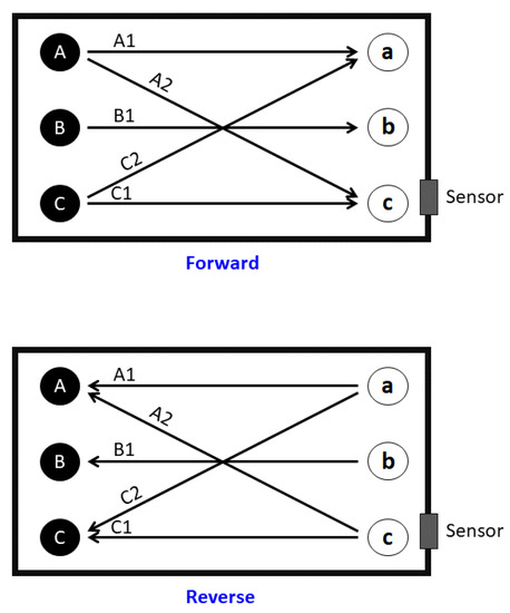 - Directional walk: We specified three starting points (A, B, and C) and three end points (a, b, and c) inside the box. The robot walked from starting points at 70 cm distance to corresponding end points, and vice versa. In addition, two diagonal directions, from Point A to Point c and from Point C to Point a, were travelled both forward and reverse, as illustrated in Figure 2. All action were repeated 25 times for each point per each direction. These walking actions are shown in Table 2 and Table 3.