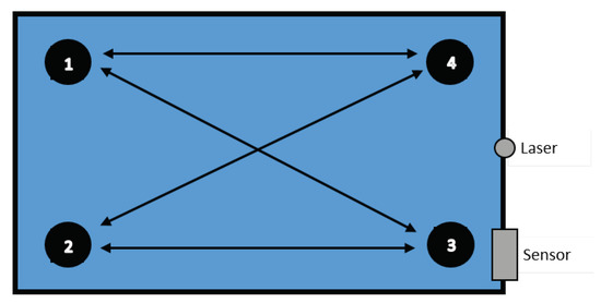 We also devised new setup with two NAO V4 humanoid robots. Firstly, one robot was standing still at Position 1 and the other robot at Position 2 walks forward and reverse to Positions 3 and 4, as shown in Figure 5. This action was repeated 10 times. In the next experiment, both robots performed actions simultaneously. Performed actions are listed in Table 6).