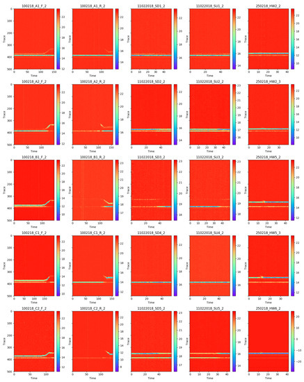 In Figure 6, we illustrate a few examples of preprocessed data, which was used in training. Columns correspond to different actions and the rows are different examples. That is, the sequences consisted of a time series of 500-dimensional vectors.