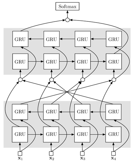In addition, GRU layers can be stacked to form a deeper GRU architecture. The first GRU layer receives as input the sequence of observations , whereas each subsequent layers are fed with activation outputs from the previous layer. We finally apply the softmax dense layer to the activations of the deepest stacked layer.