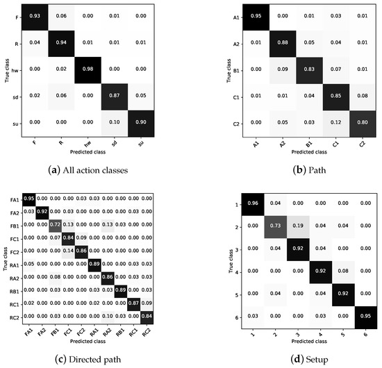 The second and third experiments were intended to classify the walking path. The former was not distinguishing walking direction. We hence defined two separate sets of labels, {A1, A2, B1, C1, C2} and {FA1, FA2, FB1, FC1, FC2, RA1, RA2, RB1, RC1, RC2}, respectively, where letters (F) and (R) before action label are used to distinguish between action in forward or reverse direction. As shown in Table 10, the model performed similarly in the two cases, with slightly worse performance not considering the walking direction than when doing so . Figure 8 shows the confusion matrices for these two experiments.