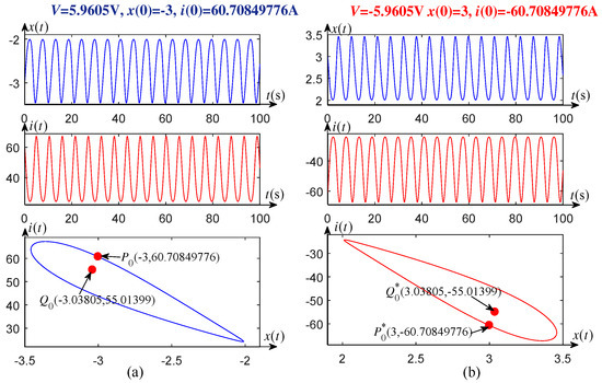 Algorithm 1 is verified as follows. Letting the parameters V, 5.97 V, and 5.9605 V in the subcritical Hopf bifurcation domain: V V, an unstable limit cycle of system (1) is found by using the above algorithm. Similarly, other ones are obtained when V, V, and V in the twin domain of V V. Specifically, when the applied DC voltages V, and symmetrical initial conditions and about the origin are selected, so that one pair of unstable limit cycles with respect to the origin symmetrically emerge from system (1), which are both ellipses as shown in the two sub-graphs below Figure 3. In addition, the corresponding equilibrium points and are obtained, which are also symmetrical about the origin. Time domain waveforms of the system states are shown in two pairs of the upper and middle subgraphs of Figure 3. The initial conditions and applied DC voltages for generating them are listed in the upper parts of Figure 3a,b, respectively.