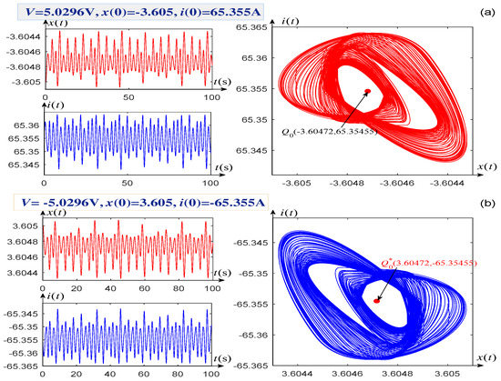When V, the singular attractors and their corresponding time-domain waveforms of the system states are shown in Figure 7a,b. In addition, the voltages V, V, and their corresponding initial conditions are marked at the upper left corners of Figure 6a,b and Figure 7a,b, respectively. It can be seen from Figure 6a,b that two singular attractors and two equilibrium points and are all symmetrical about the origin when the voltages V are selected as a pair of opposite values, V. This phenomenon also arises when the voltages V, as shown in Figure 7.