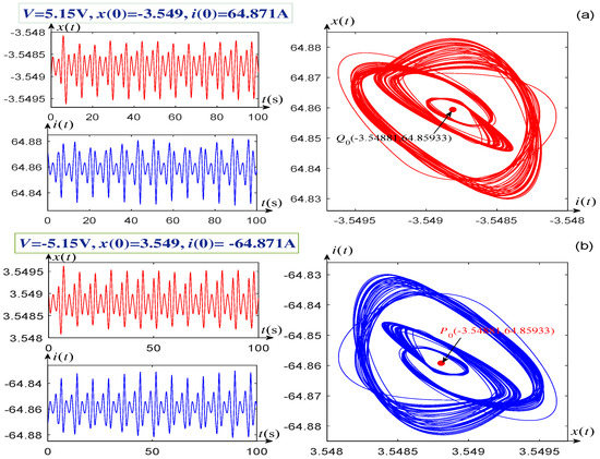 Letting the voltage V (or V), the initial conditions , A (or , A), a singular attractor of system (1) is found, as shown on the right-hand side of Figure 6a (or Figure 6b). Its corresponding time-domain waveforms of variables and are displayed on the left-hand side of Figure 6a (or Figure 6b).