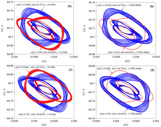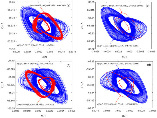 Next, the question if coexisting attractors can emerge from system (1) is discussed. By selecting an appropriate voltage V from the twin local active domains of the memristor, coexisting attractors of the associated dynamical system can indeed be found by numerical simulations. Figure 8 shows the coexisting attractors and their evolutions with voltages V, with durations t = 0–300 s and t = 8700–9000 s, respectively. The initial condition and time length for each attractor are marked in Figure 8a–d. As time t increases, one of the two singular attractors (the red attractor) shown in Figure 8a (or Figure 8c) gradually becomes a period-2 attractor, as shown in Figure 8b (or Figure 8d). Figure 9 displays the evolutions of the coexisting attractors with voltages V and durations t = 0–300 s and t = 3700–4000 s. The initial conditions and time duration for each attractor are listed in Figure 9a–d. When the duration of the simulation is t = 3700–4000 s, one of the coexisting attractors (the red attractor) in Figure 9a (or Figure 9c) evolves to a period-3 attractor, as shown in Figure 9b (or Figure 9d). It can be seen from Figure 8 that one pair of attractors shown in Figure 8a and the corresponding attractors shown in Figure 8c are symmetrical about the origin, and the same can be seen in Figure 8b,d, Figure 9a,c, and Figure 9b,d. Subtle observations reveal that the initial conditions and parameters associated with the corresponding attractors are also symmetrical about the origin.