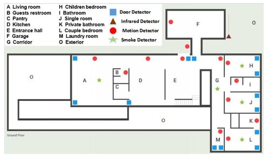Dataset A representing the ADL is generated using the HOME I/O 3D simulation environment [47]. The virtual house in HOME I/O 3D is equipped with several simulated sensors such as Passive Infra-Red (PIR) motion detectors, door entry sensors, humidity sensors, temperature sensors, and light sensors. These sensors track the occupant’s interaction in different locations in the home. A sample of the simulated environment floor plan and the sensor locations are shown in Figure 2. In our investigation, only the PIR sensors representing the occupancy in an area of the house are used.