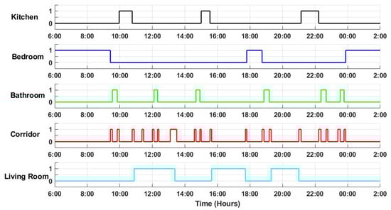 A sample of sensor data gathered from Passive Infra-Red (PIR) sensors in various locations over one-day period, where the y-axis represents the sensor status (on/off) as a binary value in different locations; and x-axis represents time in hours.