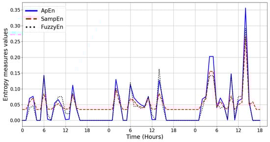 Entropy is a measure that reflects the degree of randomness or uncertainty in a system. It is considered one of the statistical measures to compute the degree of uncertainty in the data [40]. For example, Shannon Entropy defines entropy in terms of a discrete random variable. However, to evaluate the relevance of entropy measures in ADL, different types of entropy measures, namely Approximate Entropy (ApEn), Sample Entropy (SampEn), and Fuzzy Entropy (FuzzyEn), are used to identify a visitor in a home environment. These three entropy measures are more relevant for the binary signals gathered from an Intelligent Environment [41,42]. A brief description of these measures is provided below: