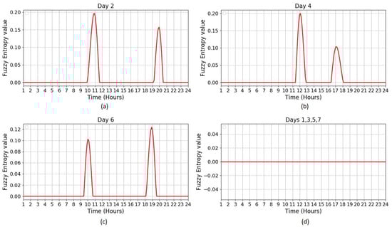 Fuzzy entropy values representing visiting time in each day compared with the standard deviation; (a–c) show that the visitor came twice in day 2, 4, and 6 because there are two bumps in the fuzzy entropy values; and (d) shows that no visitor came in day 1, 3, 5 and 7 because the fuzzy entropy values are zero (no bumps in the entropy values).