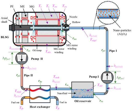The mechanism of the NBCS is described as follows. Waste heat is generated during the operation of BLSG when the temperature increases; the locations with temperature increase are marked in red in BLSG in Figure 1. Because the heat losses in PE and ME are small and those in MG are big, the temperature increases caused by heat losses in PE and ME are low and those in MG are high. Thus, the primary cooled object is MG, especially the MG stator and rotor windings, which would dramatically influence the normal operation if they are not kept in a reasonable range. The MG stator and rotor are not directly cooled by the spray nanofluid. The heat dissipations of the MG stator and rotor occur through heat conduction with the MG stator and rotor winding, respectively. The cold nanofluid stored in the oil reservoir is pumped via pump I into pipe I, and flows into the hollow of BLSG after it crosses pipe I. Then, it is sprayed to the MG stator and rotor windings in BLSG via the nozzles at the ends of the MG shaft. The nanofluid becomes hot after cooling the MG stator and rotor winding. Meanwhile, it drops from the MG stator and rotor winding surface to the bottom of BLSG under gravity and gathers in the oil sump. Pump II is used to absorb the heated nanofluid out of the oil sump to keep a normal operation of the BLSG. Before returning to the oil reservoir, the heat nanofluid is delivered through the heat exchanger, where the heat in nanofluid is transfer to the cooling fuel. Finally, the cooled nanofluid travels back to the oil reservoir papering for the next cooling cycle.