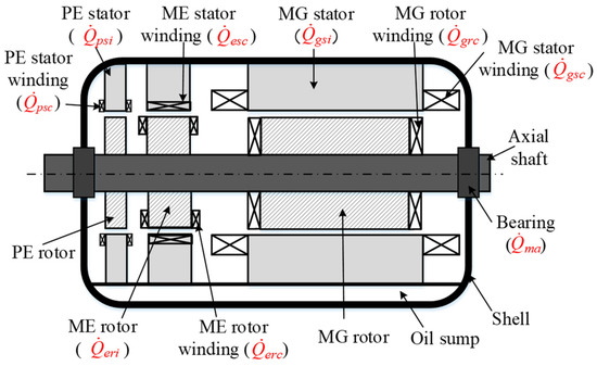 The power losses and are the heat sources of the MG stator and rotor windings, respectively. The MG stator winding is a three-phase one, while the MG rotor winding is single-phase, according to the calculation equation of copper loss given in Appendix A (a), the expressions of and are given as