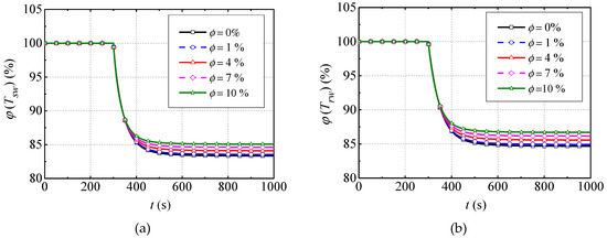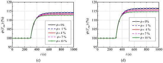 The BLSG is cooled to make sure that the temperature of MG stator and rotor windings, which are the most important parts in BLSG, are in a suitable range, thus the temperature of the MG stator and rotor windings is the most important issue for the thermal design. In order to demonstrate the effect of the nanofluid on the temperature dynamics of the MG stator and rotor windings, their energy balance models are given in Equation (2). In the models, the MG stator winding, rotor windings, and nanofluid in BLSG are treated as individual nodes, and the energy change of the nodes occur through heat convective, heat conduction, input power, and enthalpy changes caused by flowing-in and -out of the node. The other energy balance equations to obtain the temperature changes of the other nodes in BLSG are given in Appendix A (a). Besides, the convective heat transfer coefficient is applied for both MG stator and rotor winding because they are equal in value. The derivative process is given in Appendix A (e).