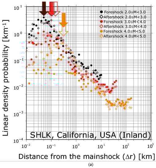 Figure 1 shows the linear density probability of earthquakes occurring before and after small mainshocks obtained from Southern California (SHKL), Japan (JMA, inland and offshore), and Taiwan (CWB) earthquakes. All regions show a convex shape with a single peak. The result of the Southern California region (Figure 1a) closely coincided with the results obtained by Lippiello et al. [5]. Curiously, even the results for Japan (both inland and offshore) and Taiwan showed a similar tendency to the results obtained by Lippiello et al. [5].
