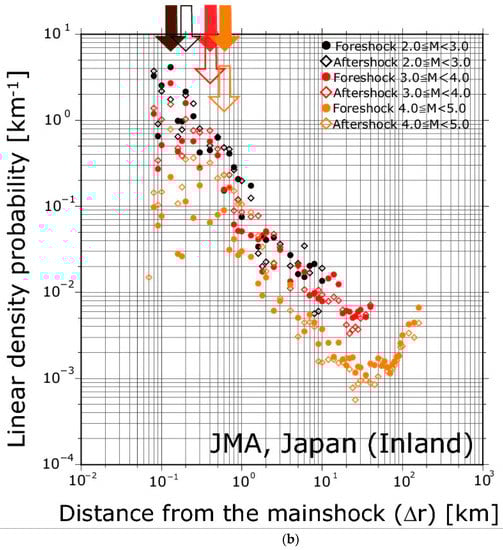 Following the method used by Felzer and Brodsky [5] and Lippiello et al. [6], we considered mainshocks as an event is identified as a mainshock if a larger earthquake does not occur in the previous y days and within a distance L (Table 1). In addition, a larger earthquake must not occur in the selected area in the following y2 days. The values of the parameters L, y, and y2 were selected as 100 km, 3 days, and 0.5 days, respectively, identical to those used elsewhere [5,6]. For mainshock magnitude class m ∈ [M, M + 1), we considered a linear density probability ρ(Δr), which we defined as the number of aftershocks (foreshocks) in the succeeding (preceding) time interval (δt = 12 h) with epicenters at a distance in the interval [Δr, 1.2Δr] from the mainshock, divided by 0.2Δr and by their total number, i.e., the linear density [6,8] divided by the total number of identified aftershocks (foreshocks). Until this point, the theoretical development was the same as that employed by Lippiello et al. [5], except that those authors fixed Δrmax = 3 km. We did not use Δrmax = 3 km because the range of mainshock magnitudes considered in our study was wider than that considered by Lippiello et al. [5]. We used the formula, Δrmax = 100 × Lf (km), where Lf is the fault length obtained by substituting M into the equation between Lf and M: log Lf = 0.6M − 2.9 [11]. By applying this method to the four datasets, and then for each dataset, Δrc values for different mainshock magnitudes were computed.