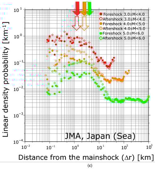 The monomodal convex shape in Figure 1 consists of three parts. In the area, which was smaller than Δrc, observed in other studies [5,7], each point of the distribution had a larger variance relative to the trend. On the other hand, in the region larger than Δrc, ρ(Δr) attenuated, following a clear power law. In addition, ρ(Δr) displayed a nearly constant fluctuation when the value of Δr was much larger. This feature, namely a nearly constant ρ(Δr), can be regarded as a region beyond the earthquake preparation area. The area of smaller than Δrc, possibly corresponding to slip areas, would be randomly generated seismicity, which yields increase or nearly constant of the linear density probability.
