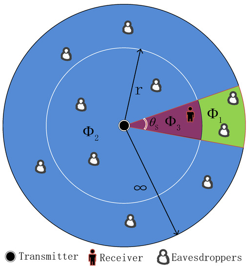 Based on the aforementioned adaptive transmission scheme, there are serious security threats when there exist one or more eavesdroppers in the sector secrecy guard zone. In order to enhance the secure transmission performance, using the superposition coding [], the transmitter transmits information-bearing signals and sends AN, namely AN assisted transmission. If there exists no eavesdroppers in the sector secrecy guard zone, the transmitter still transmits useful information signals, namely direct transmission. As previously assumed, the locations of eavesdroppers are randomly distributed, the probability of no eavesdropper existed within the sector secrecy guard zone is given by , and the probability of eavesdropper existed within the sector secrecy guard zone is given by [].