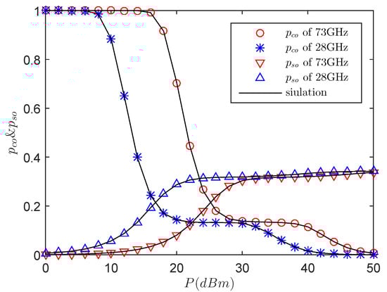 Figure 2 presents the effects of the and versus the transmit power in different frequency bands, namely 28 GHz and 73 GHz. Obviously, with the increasing of P, the reliability performance of the legitimate receiver increases due to the decrease of the COP for a given power allocation factor, while the secrecy performance would decline. When the power increases to a certain value, the SNR received by the eavesdropper is close to a fixed value from Equation (6), the SOP remains unchanged and the COP of the legitimate receiver is close to zero. This can be explained as follows: on the one hand, although the eavesdropper is in the sector guard zone, the system can still guarantee a secure link to a legitimate receiver by transmitting AN to confuse the eavesdropper. On the other hand, it is because P has different effects on the COP and SOP in the case of LOS and NLOS. In addition, when P is large, the difference of SNR between legitimate link and eavesdropping link tends to be constant. It means that the reliability of the system can be improved effectively by increasing the power of the system. Again, we obtain an important observation that secrecy transmission at 28 GHz is better than that at 73 GHz in a low transmit power region.