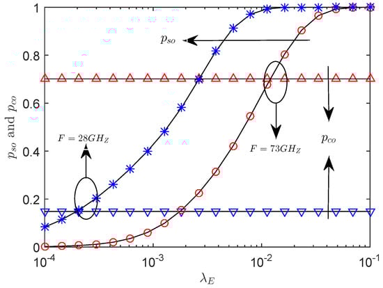 Figure 3 presents the effects of the SOP, , and the COP, , versus the eavesdropper density with the different frequency. As increases, we see that the keeps increasing and the remains constant for given a power P. In particular, compared with the 73 GHz band, the 28 GHz band reduces the and improves the reliability of the system, but at the same time increases the and reduces the secrecy performance of the system. These observations can help the system designer to select different frequency bands according to the actual performance requirements. For example, when the actual system requires high reliability, it is suitable to select the 28 GHz band.