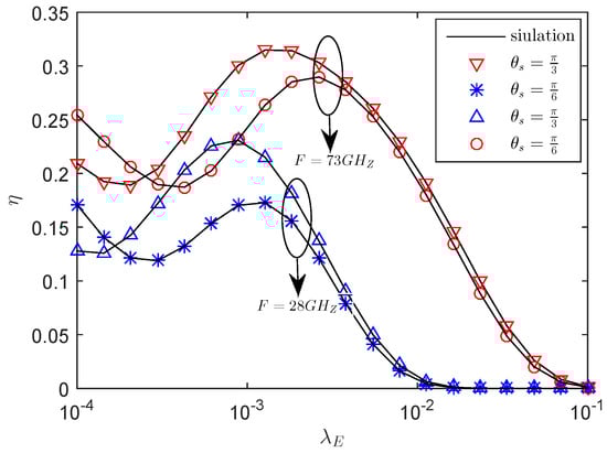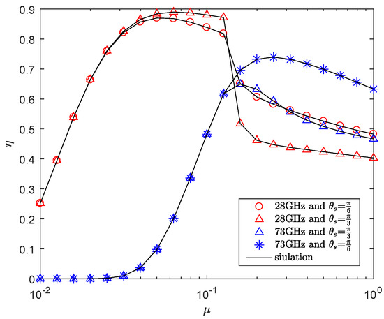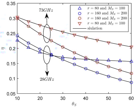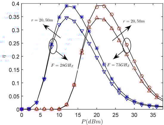 The versus , with bps/Hz, bps/Hz, P = 30 dBm, F = 28 GHz, r = 50 m, , and .