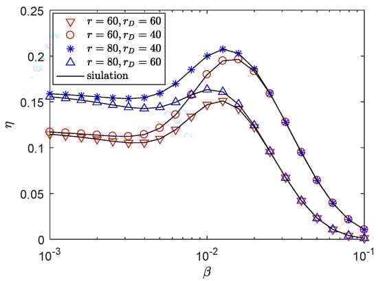 The versus with bps/Hz, bps/Hz, P = 35 dBm, r = 50 m, = 0.4, and .