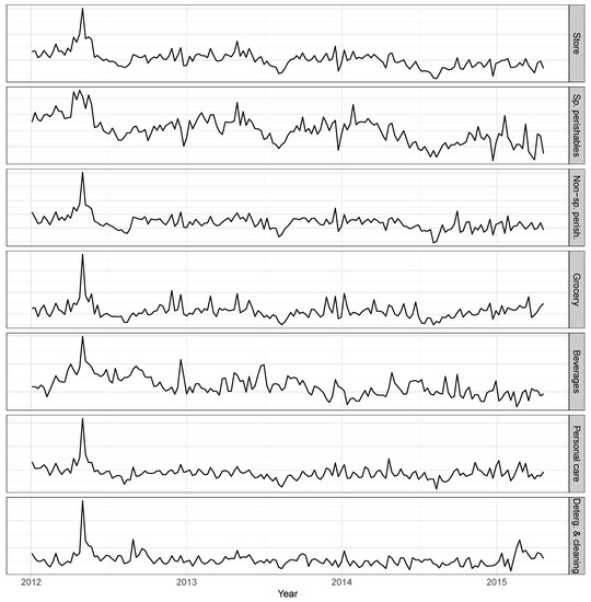 All the series show local upward and downward trends, although less prominent in the detergents/cleaning and personal care time-series. The store time-series shows a similar behaviour to the perishables time-series, as the later represent the major proportion of the total sales. These aggregate series do not show any seasonal variation.