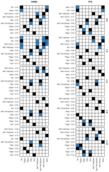 In order to find out if the forecast error differences between the several competing methods were statistically significant or not, we conducted a Nemenyi test [46]. The results of this test are shown in Figure 6. The panels on the left side show the results for the complete hierarchy using ARIMA base forecasts, for each forecast horizon; while the panels on the right side show the respective results using ETS base forecasts. In the vertical axis, the methods are sorted by MSE mean rank. In the horizontal axis, they are ordered as in Table 3 and Table 4. In each row, the cell in black represents the method being tested and any blue cell indicates a method with no evidence of statistically significant differences, at a 5% level, while the white cells indicate methods without such evidence. We use the Nemenyi test implementation available in the tsutils [47] package for R.