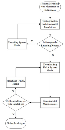 Figure 2 shows the basic flow chart of the FPAA designs. The analog signals of FPAA are limited to the range −3 V to +3 V. Therefore, we test the system with the numerical simulation before using the FPAA design system. Then we decide to rescale the system or not according to the simulation results. If there is something noticeable, we usually use matlab to simulate the system because the simulation tool of FPAA is too slow and the simulation time is too short. Then the system is designed in the FPAA design software, which is similar to the Simulink module of matlab. After setting up the circuit, the configuration information will be downloaded to the FPAA development board by clicking the download button in the software. The experimental results are compared with the simulation results, and if the results are satisfactory, the implementation is finished, otherwise FPAA modeling needs to be modified.