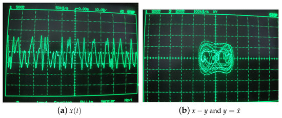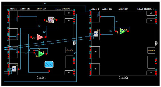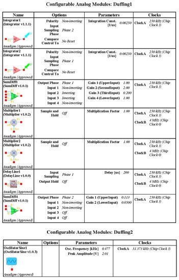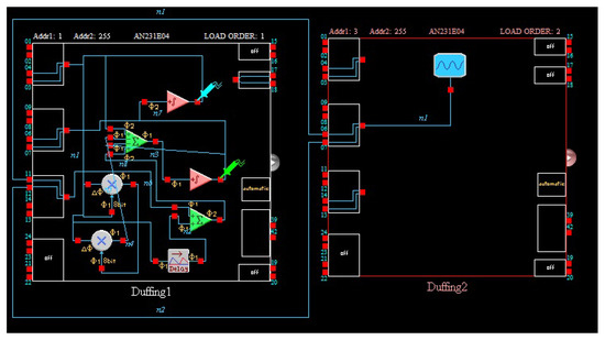 Then the Duffing system is modeled with an FPAA software tool. The Duffing system also needs an AC source module, which is different from autonomous time-delay chaos system. Attention should be paid to the time scale conversion when the analog circuit is constructed by the Equation (