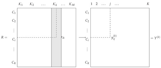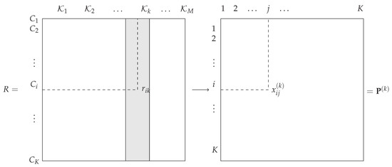 The disagreement between the rankings from classifiers and is measured by . The kth permutation can be represented by a permutation matrix , with if class i is positioned in place j and 0 otherwise (see Figure 2). Therefore, the constraint in Equation (11) imposes . Let with tensor Einstein notation. Equation (11) can then be rewritten: