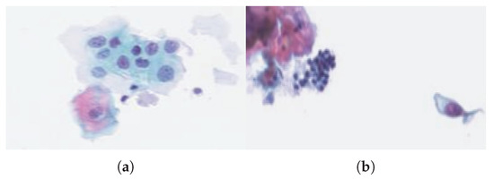 Images of cervical cells colored with Papanicolaou stain. (a) Clumps of abnormal cells with large nuclei. (b) Abnormal cells with dense nuclei.