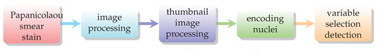 The images were colored with Papanicolaou stain, which is the most widely used reference color for the screening of cervical cancers; it makes it possible to distinguish the different nuclei, which are colored in blue, the mother cells in dark purple to black, and the keratinized and squamous epithelium. The images were then segmented into thumbnail images of pixels which correspond a priori to objects. Most of the time, these objects are nuclei, but they may sometimes be non-identified objects that we call “noise”. Indeed, they can correspond, for example, to a poor segmentation, a superimposed nuclei, etc.