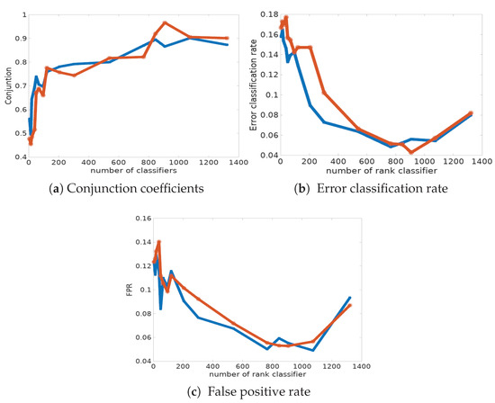 if all of the classifiers propose the same rankings, because or . Then . From (A1), . Therefore, we define the conjunction coefficient as