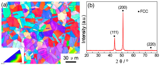 Figure 1a shows the inverse pole figure (IPF) of the as-extruded CoCrFeNiMo0.2 HEA. It is obvious that the extruded alloy exhibits an equiaxed grain structure with an average grain size of approximately 20 μm. The relative density of the as-extruded alloy is approximately 99.5%. The consolidated microstructure is fully recrystallized, indicating that recrystallization occurred during and after the extrusion. Figure 1b shows the XRD patterns of the P/M CoCrFeNiMo0.2 HEA, where the alloy shows clearly a single FCC structure.