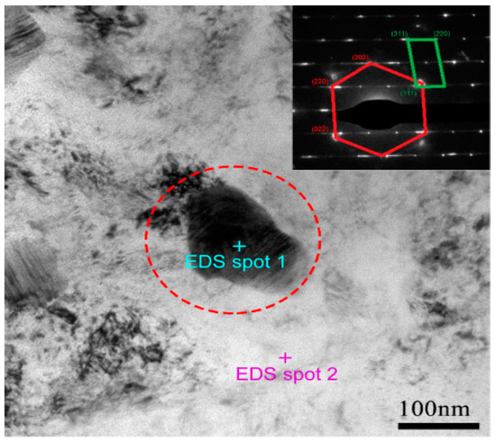 In order to further identify the crystal structure of the P/M CoCrFeNiMo0.2 HEA, we performed the TEM analysis on the precipitated phase. It is reported that the σ phase and μ phase in the CoCrFeNiMox alloy systems is corresponding to the stoichiometric (Cr,Mo)(Co,Fe,Ni) and (Mo,Cr)7(Co,Fe,Ni)6 respectively [26,27]. The EDS analysis results in Table 1 clearly indicates that the chemical composition of the precipitates contains a high concentration of Mo, which is very close to the σ phase reported by Shun et al. [27,28]. The selected electron diffraction pattern embedded in the upper right corner of Figure 3 also confirms that the white precipitates are σ phase. This result is also consistent with the calculated pseudo binary (CoCrFeNi)-Mo phase diagram [14].