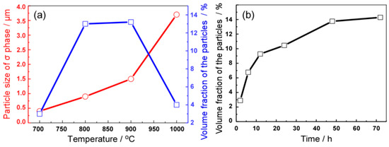 (a) Variation of the average size and volume fraction of σ precipitate with annealing temperatures; (b) Variation of the volume fraction of σ precipitate with annealing times at 800 °C.