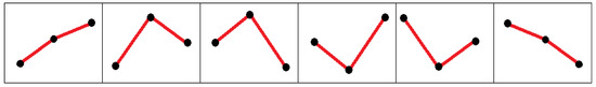 All possible patterns for embedded dimension , from a three-point sequence . The patterns represented, from left to right, are , , , , , and . The difference in amplitude between data points does not affect the pattern, as long as the order is preserved.