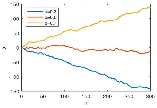 Simulated paths for MPE testing, where p is the probability of for dimension . The graph shows sample paths for , ,