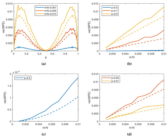 Figure 3a shows the variance of the MPE (19) as a function of p for . The lines correspond to a normalized time scale of , and . The variance presents symmetry with respect to the middle value of . This is to be expected, as for , the variance has only one degree of freedom. The structure is preserved, albeit scaled, for different values of m.
