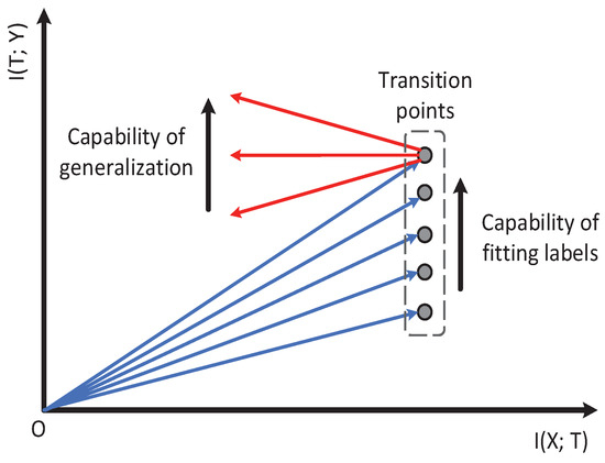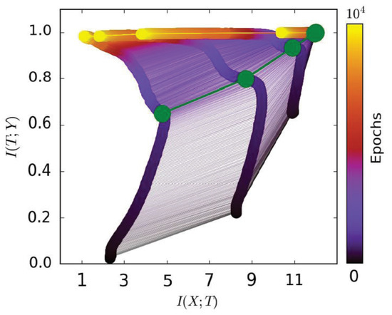 Different from the work in [23,24,25], Ravid and Naftali [26] took IB as a visualization tool to understand how neural networks work in general. Specifically, they estimated the mutual information and for each hidden layer, where X is the input data, Y is the label, and T is the hidden layer output, respectively. Figure 1, from [15], draws , with training epochs in the two-dimensional plane (referred to as the information plane). From the figure, the green points (transition points) separate mutual information paths into two stages: