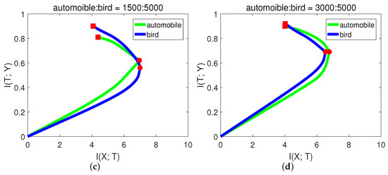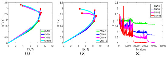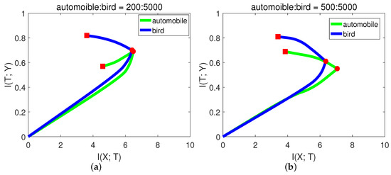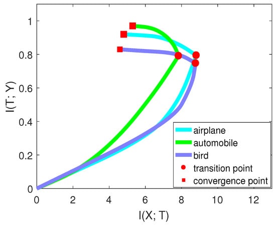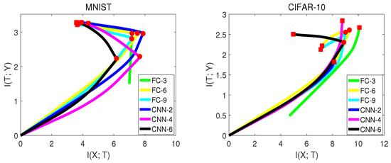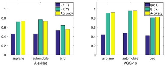Suppose there are C classes in the dataset and denotes the ith class. To evaluate networks on the ith class, we labeled other classes as one class. Thus, the dimension of label Y changes from C to two. We also made label Y balanced when calculating mutual information so that is equal to one. This process is similar to one-vs.-all classifications [31]. However, instead of concentrating on the accuracy, we paid attention to the mutual information. Furthermore, notice that we did not change the network structure; we only performed pre-processing on the validation data. The training scheme and other conditions did not change during this process. We selected three classes (airplane, automobile, bird) on CIFAR-10 to perform the experiment. Figure 8, from [15], compares the performance of two networks on these three classes. Figure 9, from [15], shows the mutual information curve on each class in the information plane.