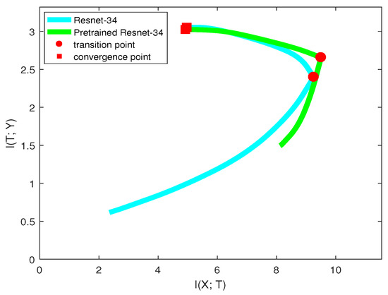 We can see for these two models that they had very similar curves in the “compression” phase and ended up with the same convergence point. However, in the “fitting” phase, they acted differently. The pre-trained model had larger and at the initial time, which contributed to the similarity between CIFAR-10 and the ImageNet dataset. Thus, pre-trained model reached the transition point much faster than the base model. After the transition point, since they had the same architecture, the generalization capabilities for these two models were the same.