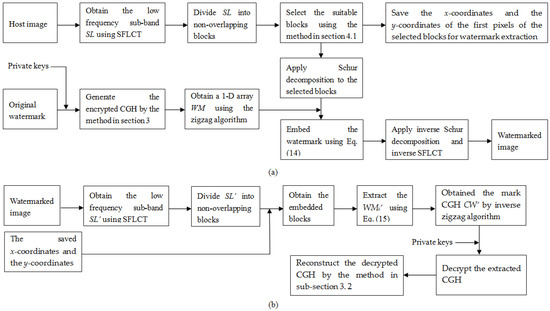 Figure 1 delineates the flowchart of the proposed method. In Figure 1a,b are the diagrams of the watermark embedding process and the watermark extraction process, respectively.