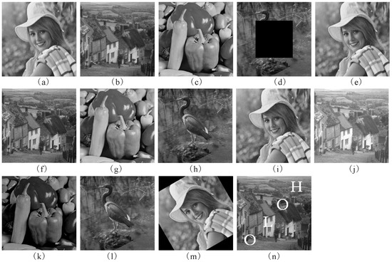 The attacked watermarked images. (a) Gaussian low-pass filtering (PSNR = 32.54); (b) average filtering (PSNR = 32.42); (c) median filtering (PSNR = 34.9); (d) occlusion (PSNR = 15.06); (e) JPEG (PSNR = 35.95); (f) unsharp (PSNR = 27.74); (g) burring (PSNR = 34.03); (h) Gaussian noise (PSNR = 32.89); (i) salt & pepper noise (PSNR = 28.5); (j) brighten (PSNR = 14.15); (k) darken (PSNR = 14.52); (l) rescaling (PSNR = 34.67); (m) rotation (PSNR = 13.17); (n) painting (PSNR = 20.34).