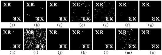 The corresponding reconstructed images of the CGH extracted from the distorted watermarked images in Figure 4. (a) Gaussian low-pass filtering; (b) average filtering; (c) median filtering; (d) occlusion; (e) JPEG; (f) unsharp; (g) burring; (h) Gaussian noise; (i) salt & pepper noise; (j) brighten; (k) darken; (l) rescaling; (m) rotation; (n) painting.