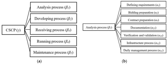 CSCP consists of five main processes: analysis process (β1), developing process (β2), receiving process (β3), running process (β4) and maintenance process (β5), as shown in Figure 2a. Their results determine the trustworthiness of CSCP. Supporting process and organizing process, as components or influencing factors of the main process, impact the trustworthiness of each main process. Figure 2b–f provide a hierarchical graph of five main processes respectively and their influencing factors, including a total of 33 risk factors: Defining requirements (), Bidding preparation (), Contract preparation (), Requirement review (), Proposal preparation (), Award of contract (), Project programming (), Joint review (), Product delivery (), Requirements analysis (), Structure design (), Detailed design (), Coding test (), System integration (), Software installation (), Operation plan (), Operational testing (), Operations management (), Change analysis (), Change implementation (), Maintain test (), Maintain acceptance (), Software transportation (), Software abandoned (), Documentation (), Configuration management (), Quality guarantee (), Verification and validation (), Audit process (), Problem solving (), Daily management process (), Infrastructure process (), and Training process (). Section 4 details the calculation of the trustworthiness for each main process and the whole CSCP process according to the hierarchical relationship in Figure 2.