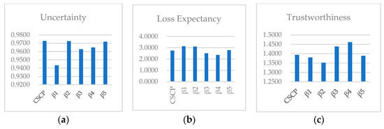 Results. (a) Uncertainty of CSCP; (b) Loss Expectancy of CSCP; (c) Trustworthiness of CSCP.