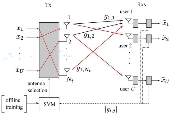 - We establish a communication system with an SVM module that allocates transmit antennas to each user in multiuser communication networks with partial channel state information at the transmitter (CSIT), as shown in Figure 1. The antenna allocation method is designed for a frequency-division duplex (FDD) system, where only quantized channel gain information is available.