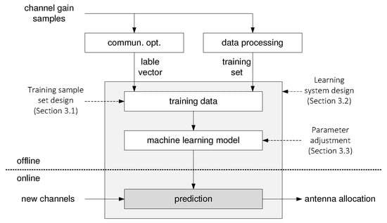 - We interpret the antenna allocation system for multiuser communication as a multiclass classification learning system. For the components of the learning system, such as the training data and the corresponding class labels, we first model the counterparts in the conventional communication system, and we then construct them with a proper format for the learning system.