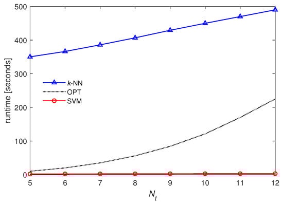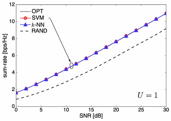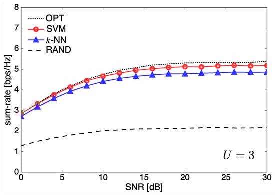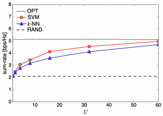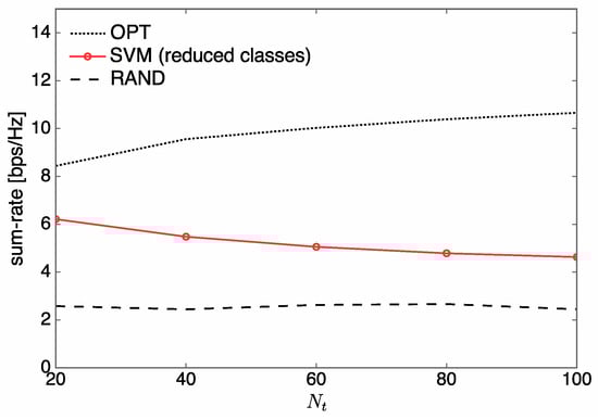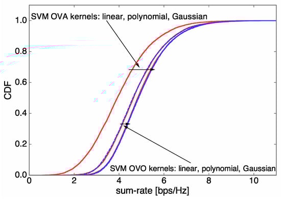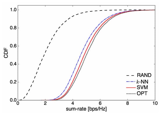 - The parameters of the designed SVM are tuned based on extensive numerical experiments in order to improve the sum-rate performance of the communication system. For the designed SVM, we find that a Gaussian function is a good choice for the kernel function, which is one of the most important parameters for tuning SVMs. (Artificial neural networks (ANNs) can also be employed in our learning system, which may result in a slightly better sum-rate performance at the expense of both higher computational complexity and a larger training dataset than for k-NN and SVM. Thus, ANNs are not considered in this study as our main focus is on the design of learning systems showing a significant reduction in complexity from the optimization-based approach with marginal sum rate reduction.) From our rigorous simulation, the variance (kernel scale) and penalty parameter (box constraint) of an SVM kernel function are determined by 21.56 and 7.67, respectively.