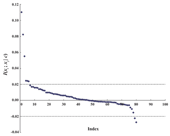 The definitions of MI and CMI are measures of the average dependence between attributes implicated in the training data. In contrast to those, local mutual information (LMI) and conditional local mutual information (CLMI) can weigh the direct dependence and conditional dependence relationships between attribute values implicated in each instance [16,24]. Similarly, we sort the attribute values by comparing the sum of CLMI (SCLMI) and .